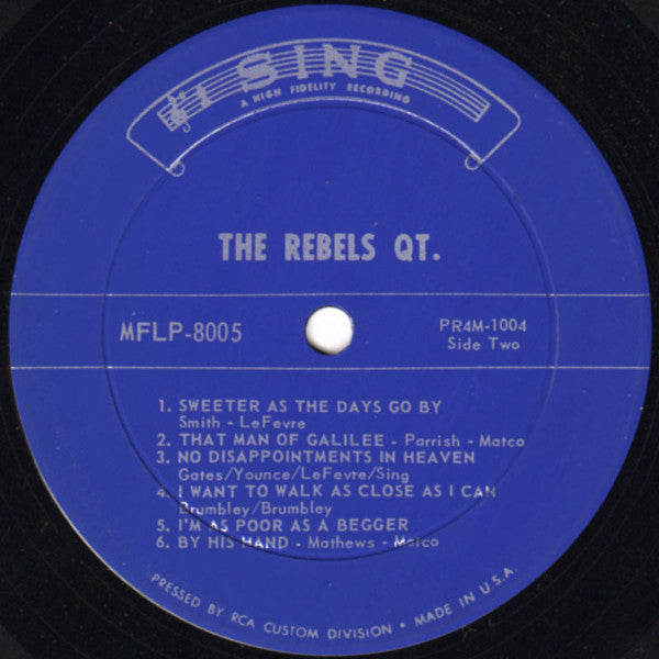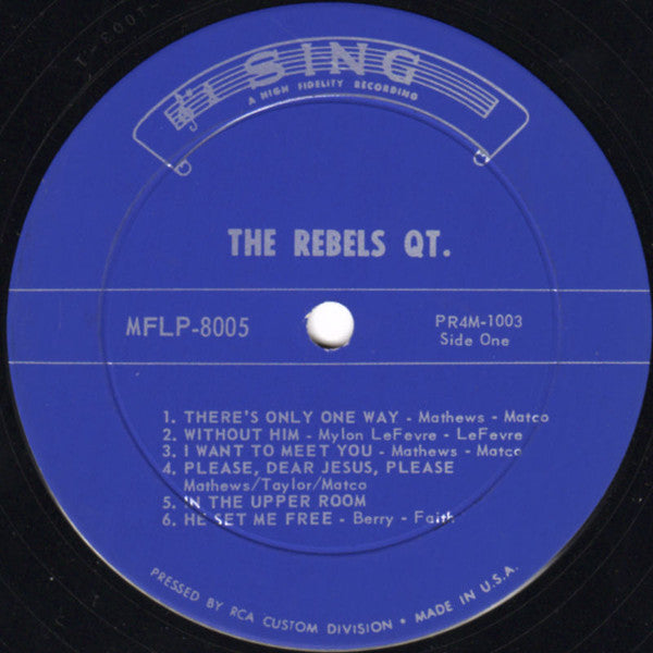Album title does not appear on labels. Group name appears on labels as "The Rebels Qt." Catalog number MFLP 8005 from cover, MFLP-8005 from labels.