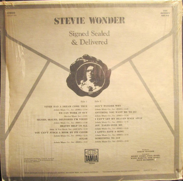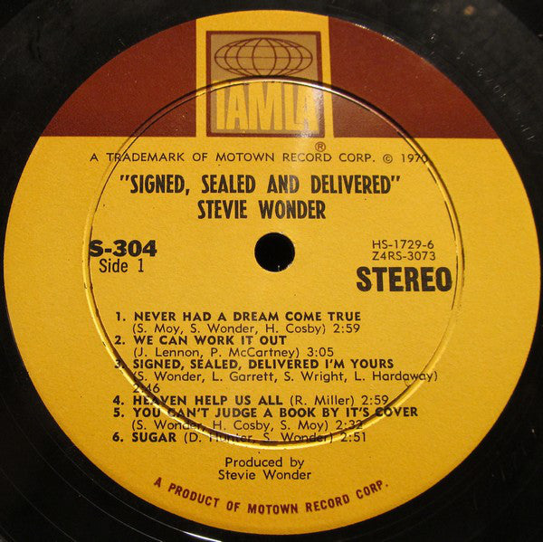 RCA Records Pressing Plant, Hollywood pressing denoted by "H" stamp in runouts. S-304: deep groove labels TS304: spine and front jacket TS 304: front jacket Title of album: Signed Sealed & Delivered - front/rear jacket Title of album: Signed, Sealed And Delivered - spine Title of album: "Signed, Sealed And Delivered" - on labels