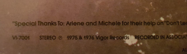 ℗ © 1975 & 1976 Vigor Records Recorded in association thru Delite Recorded Sound Distributed by P.I.P. Records - A division of Pickwick Intl., Inc. A1, A2, B2, B3: Sister John Music / Vignette Music Inc. - BMI A3, B5: Blendingwell Music - ASCAP A4, A5, B1: Vignette Music Inc. - BMI B4: Sister John Music - BMI Also released with white labels.