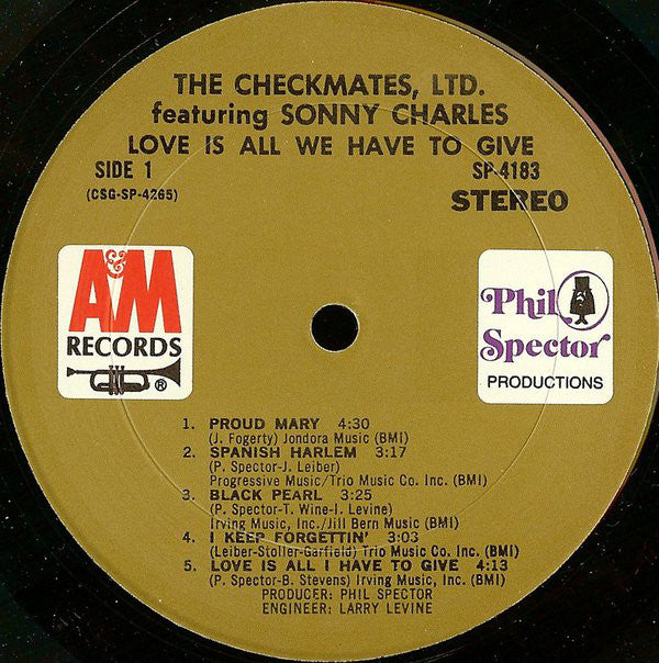 Copies have "CSG process" sticker on rear cover. Note labels have title credited as "Love Is All I Have To Give featuring Sonny Charles", covers do not.