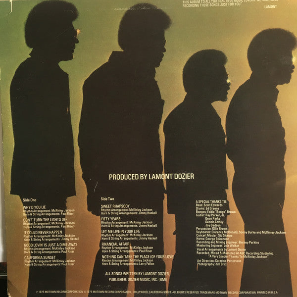 Recorded, mixed and mastered at ABC Recording Studio Inc. On Behalf Of The Originals And Myself, I'd Like To Dedicate This Album To All You Beautiful Music Lovers. We Had A Ball Recording These Songs Just For You. -Lamont Dozier-