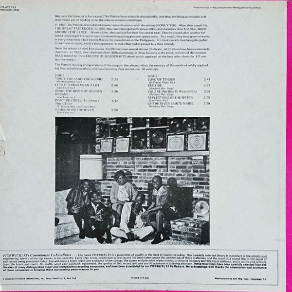 Different label artwork than 2668627 and 4373211. Most significant is the presence of "(Printed in U.S.A.)" on both labels. Rear cover: A product of Pickwick International, Inc., Long Island City, 1, New York (Printed in U.S.A.) Manufactured by Keel Mfg. Corp., Hauppage, L.I. Publishers: A1: Wildwood Mus. Inc. A2, A3, A5, B4: Leo Feist, Inc. A4: E. Presley Music, Inc./Travis Music B1: E. Presley Music Co. B2, B3, B5: Robbins Mus. Corp.