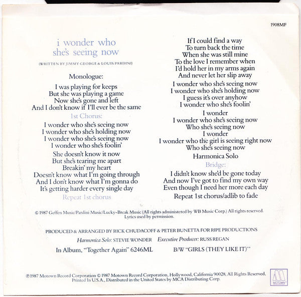 Label text layout variation A - Wb Music Corp. / Geffen Music / Lucky Break Music / Pardin Music (ASCAP) In album "244456" 6246ML B - Juldam Music / Macaluso Music (ASCAP) In album "163746" 6207GL ℗ 1987 Motown Record Corporation Motown Record Corporation • Distributed in the United States ny MC Distributing, Inc.