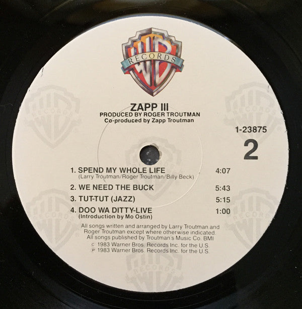 Track listing on back sleeve reverses A2, A3 © ℗ 1982 Warner Bros. Records, Inc. for the U.S. & WEA International Inc. for the world outside of the U.S. Made in U.S.A. Recorded at Troutman Sound Labs (I and II), 1835 Catalpa Drive, Dayton, Ohio. Originally mastered at Warner Bros. Recording Studios, North Hollywood, California.