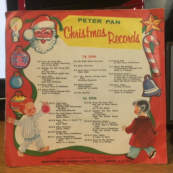 Looks similar to [r=3361327 but the b-side label has a Santa design instead of the Christmas tree. Peter Pan Christmas Records © 1956 by James & Jonathan Inc. Printed in U.S.A.