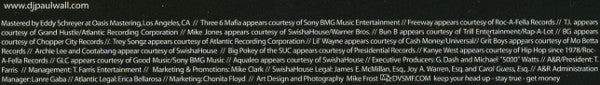 Mastered [… at Oasis Mastering, Los Angeles, CA. // Three 6 Mafia appears courtesy of Sony BMG Music Entertainment // Freeway appears courtesy of Roc-A-Fella Records // T.I. appears courtesy of Grand Hustle/Atlantic Recording Corporation // Mike Jones appears courtesy of SwishaHouse/Warner Bros. // Bun B appears courtesy of Trill Entertainment/Rap-A-Lot // BG appears courtesy of Chopper City Records // Trey Songz appears courtesy of Atlantic Recording Corporation // Lil' Wayne appears courtesy of Cash Money/Universal // Grit Boys appears courtesy of Mo Betta Records // Archie Lee and Cootabang appear courtesy of SwishaHouse // Big Pokey of the SUC appears courtesy of Presidential Records // Kanye West appears courtesy of Hip Hop since 1978/Roc-A-Fella Records // GLC appears courtesy of Good Music/Sony BMG Music // Aqualeo appears courtesy of SwishaHouse