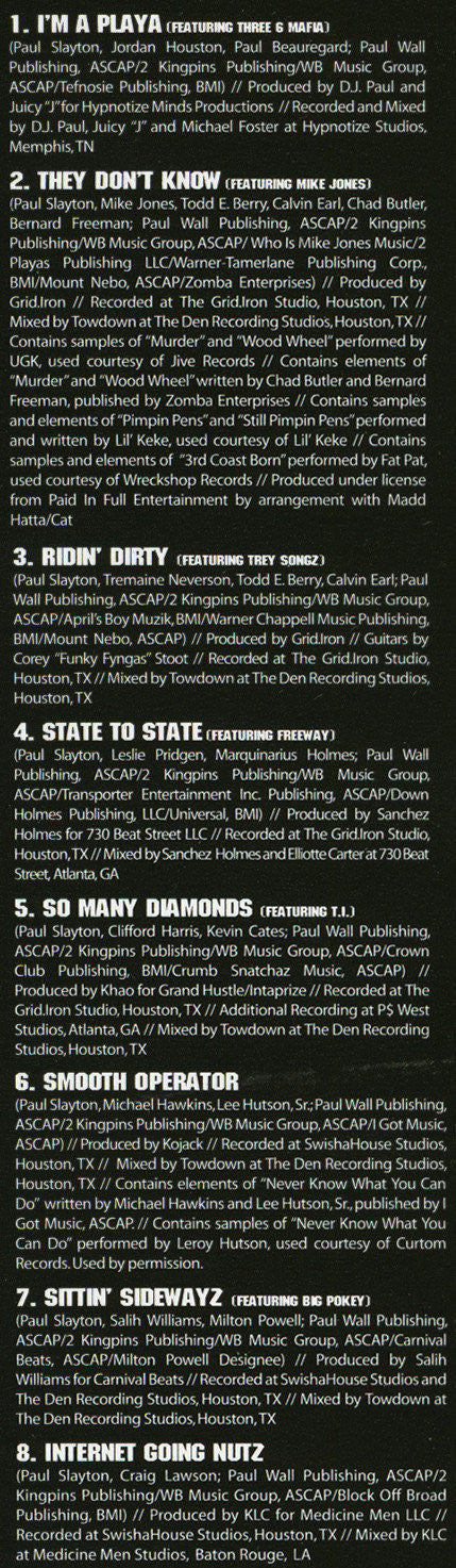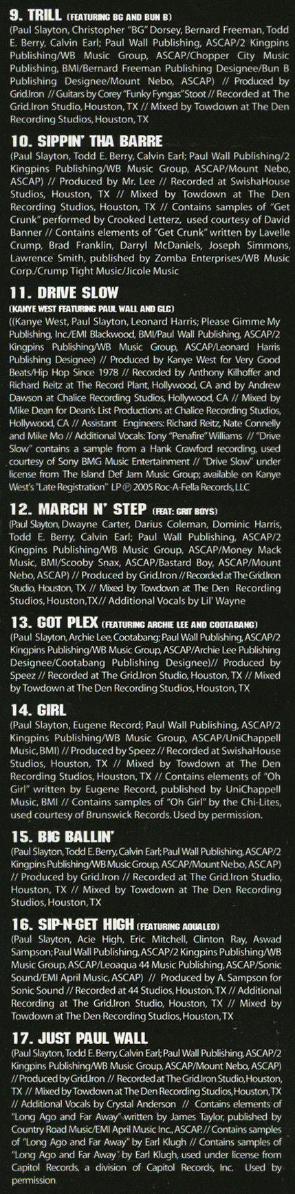 A3: Paul Wall Publishing, ASCAP/2 Kingpins Publishing/WB Music Group, ASCAP/April's Boy Muzik, BMI/Warner Chappell Music Publishing, BMI/Mount Nebo, ASCAP