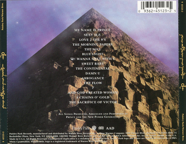 Censored version, pressed by Specialty. Also available in an Explicit version. Standard jewel case with a golden '():format(jpeg):mode_rgb():quality(96)/discogs-images/A-293637-1406996374-5786.jpeg.jpgLove Symbol' imprint and 6 panel fold-out leporello. Recorded and mixed at Paisley Park Studios, Mpls., MN. Additional mixing at Lattabee West Studios. Tracks 6 & 17 are segues and don't appear in the tracklist. Track 8 is printed as "[Eye symbol Wanna Melt With U"