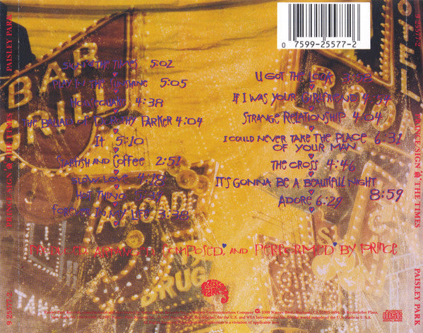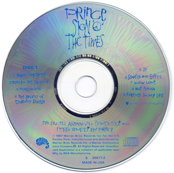 1990s repress with SID codes. Issued in a shrink-wrapped double-thick "fatboy" jewel case, with a purple rectangular sticker on the shrink wrap providing the artist & title logo plus the text "Two Disc Set" and "2-25577". Includes a 20-page booklet. Info on rear inlay: Paisley Park Records, manufactured and distributed by Warner Bros. Records Inc., a Warner Communications Company [Warner logo® 3300 Warner Blvd., Burbank, CA 91505-4694. 75 Rockefeller Plaza, New York, NY 10019-0908. ©1987 Paisley Park Records Inc. ℗1987 Warner Bros. Records Inc. for the U.S. and WEA International Inc. for the world outside of the U.S. Made in U.S.A. Info on disc face: ℗ 1987 Warner Bros. Records Inc. for the U.S. Paisley Park, manufactured and distributed by Warner Bros. Records Inc., a Warner Communications Company [Warner logo® [... Mfg. by WEA Manufacturing. Made in USA