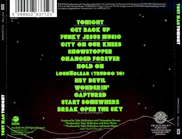 Track 13 contains a hidden track. "Break Open the Sky" lasts 4:16, followed by 0:28 of silence, followed by the hidden track, a tongue-in-cheek reprise of "Funky Jesus Music." All tracks recorded at fabmusic, Franklin, TN except "Funky Jesus Music" and "City on Our Knees" recorded at 300 Franklin Recording, Franklin, TN. Mastered at Sterling Sound John Cooper of Skillet appears courtesy of Atlantic Records Israel Houghton appears courtesy of Integrity Media, Inc. Matthew Thiessen of Relient K appears courtesy of Mono vs Stereo Ayiesha Woods appears courtesy of Gotee Records Truett "TruDog" McKeehan and Judah McKeehan appear courtesy of Toby and Amanda McKeehan ℗ & © 2010 ForeFront Records®. Manufactured by EMI CMG Label Group. Distributed in the U.S.A. by EMI CMG Distribution. Printed in the U.S.A.