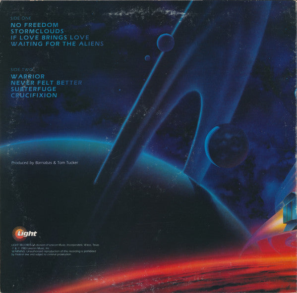 Inner sleeve with all lyrics, band photo and credits. Recorded August-September, 1983 at Triad Studios, Des Moines, Iowa ℗ & © Lexicon Music, Inc. All songs copyrighted © 1983 Lexicon Music, Incorporated. (ASCAP) Printed in U.S.A. Catalog numbers: LS 5829: cover, spine LS-5829: labels Special thanks: God, Milt & Joe Rodriguez, Bill Cole, Anthem, Brian & Alice Smith, Jean Morgan, Rick Stowers, Ted Wilson, Lisa & B.J. Mann, Ellen Klingensmith, Diane Edwards. The following equipment was used in the performance and production of this album: Lab Series L-5 100 watt amplifier and 4 x 12 speaker enclosure Marshall 100 watt amplifier and 4 x 12 speaker enclosure Roland SIP 300 pre amp DiMarzio Explorer and Stratocaster guitars Roland Juno 6 synthesizer Apple 2 + 64K/Alpha Syntari digital synthesizer/computer system Yamaha 7' 4" grand piano Rhodes electric piano Rickenbacker bass guitar Rodgers drums Zildjian cymbals Synare percussion synthesizer MCI 24-track 2" format tape recorder (30 IPS) MCI JH-528 24 channel mixing console with automation Ampex ATR-100 1/2 track 1/4" recorded (30 IPS) EMT T-240 gold foil reverb Eventide H-949 harmonizer UREI LA-3 & 1178 limiters UREI & Eventide digital delays B & B outboard equalizers UREI stereo parametric equalizer