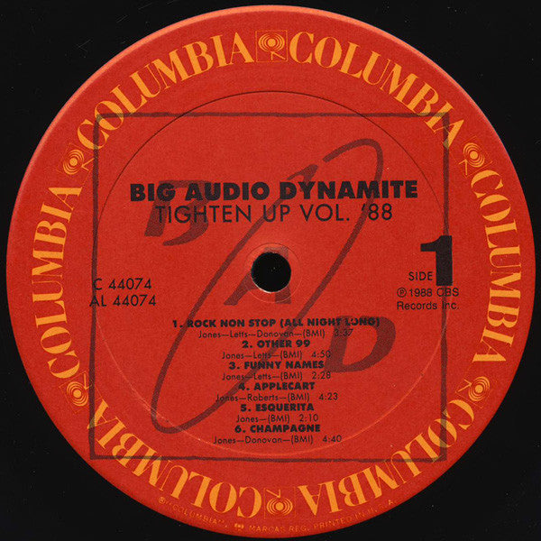 Recorded & Mixed at Beethoven St. Studios West London Spring '88. © 1988 CBS Records/Ⓟ 1988 CBS Records Inc./Manufactured by Columbia Records/CBS Records Inc./New York, NY All songs except (*) © 1988 Big Audio Dynamics Music Inc. (BMI) *Battle Of New Orleans *Duelin Banjos Guess Who's Coming To Dinner: Daisy, Lauren, Audrey, Jet, Patsy, Tony James, Glorya Hall, Raymond, Russell Otis, Lisa, Lewis, Bibs Allsaints Road, Marek Kanevskà, Video City (Notting Hill Gate), Joe, Paul and Topper, Chris Salewicz, Pennie Smith, Alan Rogan, Tarquin Gotch, Gerb, Kiely, Petey Pete, Dr. Revolt, Haze, Jim & Sara, Futura, Zeph, Ira Lippy, Gigi, Mark Zermatti, Willy (CBS Germany), Andre Schapps, Casio, Paiste. FC 44074 appears on spine, C 44074 appears on labels, 44074 appears on inner sleeve. Includes printed inner sleeve with color pictures, artwork, lyrics and credits. Track B2 listed on labels as: 2a. The Battle Of All Saints Road Incorporating: 2b. Battle of New Orleans 2c. Duelin' Banjos