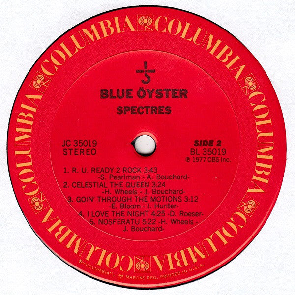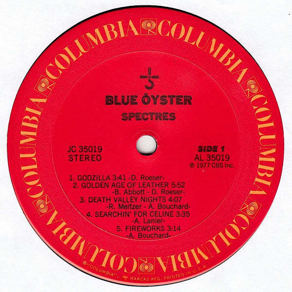 Band name on labels is "Blue Öyster". Inner sleeve with band's logo on both sides. Godzilla appears courtesy of AA Wonderland Records.
