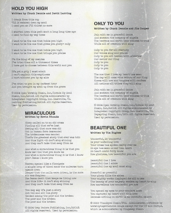 Hold You High © 2004 Open Worship Music, Inc. / Invade My Soul Music, Inc. / ASCAP. All rights administered by Integrated Copyright Group Inc. Nashville, TN. Larring Publishing / ASCAP. Only To You © 2004 Open Worship Music, Inc. / Invade My Soul Music, Inc. / ASCAP. All rights administered by Integrated Copyright Group Inc. Nashville, TN. Dayspring Music, Inc. / BMI. Miraculous © 2004 Grey Fedora Publishing, Inc. / ASCAP. Beautiful One © 2002 Thankyou Music / PRS. Administered worldwide by worshiptogether.com Songs except for the UK and Europe, which is administered by Kingsway Music. Reveal © 2001 Open Worship Music, Inc. / ASCAP. All rights admin. by Integrated Copyright Group Inc. Nashville, TN. Throne Of Grace © 1991 Mercy/Vineyard Publishing (admin. in North America by Music Services o/b/o/ Vineyard Music Global, Inc.) God Of Wonders © 2000 Storm Boy Music / BMI (admin. by The Loving Company) / New Spring Publishing, Inc. / Never Say Never Songs / ASCAP (both admin. by Brentwood-Benson Music Publishing, Inc.) Your Beloved © 1996 Mercy/Vineyard Publishing (admin. in North America by Music Services o/b/o/ Vineyard Music Global, Inc.) It Is Well © 2004 Open Worship Music, Inc. / ASCAP. All rights administered by Integrated Copyright Group, Inc. Nashville, TN. Don't Forget My Music / ASCAP. Dayspring Music, Inc. / BMI. Lord Let Your Glory Fall © 1998 Thankyou Music / PRS. Administered worldwide by worshiptogether.com Songs except for the UK and Europe, which is administered by Kingsway Music. Jesus Washed © 2004 Open Worship Music, Inc / Invade My Soul Music, Inc. / ASCAP. All rights administered by Integrated Copyright Group Inc. Nashville, TN.