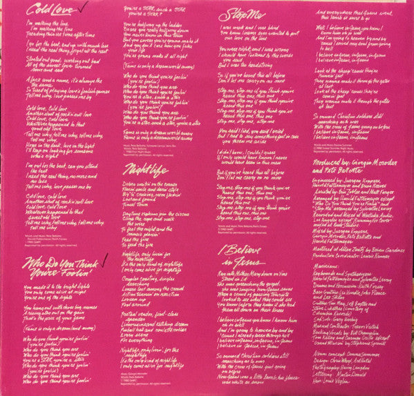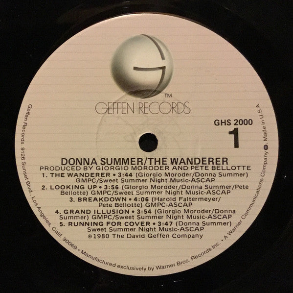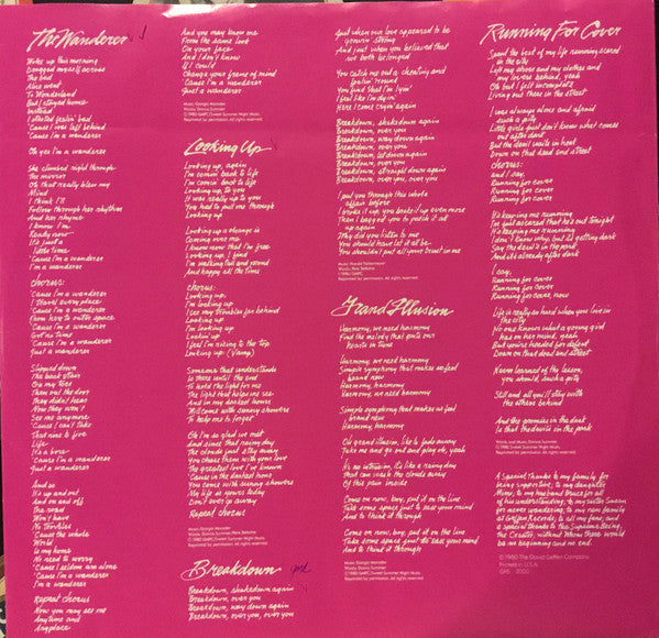 "**" and "LW" in runouts denotes a [l313266 pressing. Inner sleeve: lyrics, credits Tracks A1, A2 and A4 ©1980 GMPC/Sweet Summer Night Music Tracks A3, B1, B3 and B4 ©1980 GMPC Tracks A5 and B5 ©1980 Sweet Summer Night Music Track B2 ©1980 First Night Music. Recorded and Mixed at Westlake Audio, Los Angeles except "Running For Cover" mixed at Rusk Studios. Mastered at Allen Zentz Steve Lukather courtesy of Columbia Records. [spine: ℗1980 The David Geffen Company. Printed in U.S.A. [sleeve rear: Manufactured exclusively by Warner Bros. Records Inc. (...) Made in U.S.A. [inner sleeve: ©1980 The David Geffen Company. Printed in U.S.A. [labels: ℗1980 The David Geffen Company (...) Manufactured exclusively by Warner Bros. Records Inc. (...) Made in U.S.A. Summer Nights, Inc. [rear sleeve, next to 'Susan Munao Management Co., Inc.', with no role specified