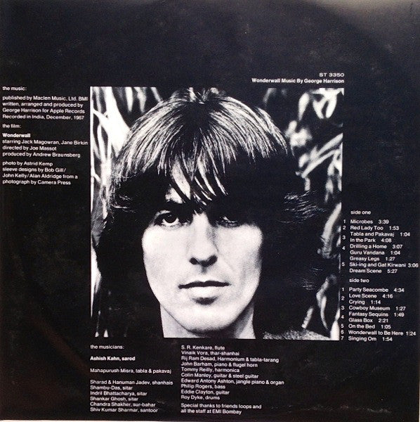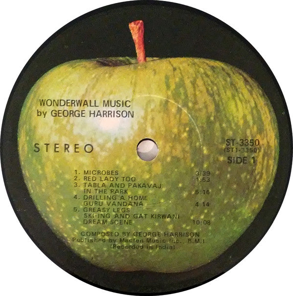Early pressing with "Mfd By Apple" on the sliced side perimeter. Soundtrack from the British film "Wonderwall". Included an insert with the album credits on it. This is the Jacksonville pressing, as identified by "O" in the run-outs. Recorded in India, December, 1967. This was the very first solo release by any member of the Beatles.