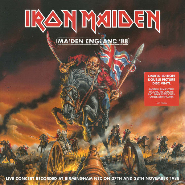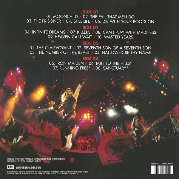 "Live concert recorded at Birmingham NEC on 27th and 28th November 1988" Shrinkwrap sticker text: "Limited Edition Double Picture Disc Vinyl" "Digitally remastered historic '88 concert including 3 previously unreleased encores" "Digital remaster ℗ 2013 the copyright is this sound recording is owned by EMI Records Ltd. except Side 04 tracks 06 to 08" "℗ 2013 the copyright in this sound recording is owned by EMI Records Ltd. © 2013 Iron Maiden Holdings Ltd." These discs are manufactured from vinyl which includes pictures. By nature of this manufacturing process, sound quality might be compromised.