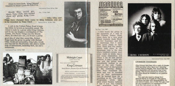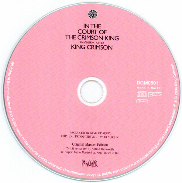 Original Master Edition - with splicing tape still present between the various songs, and crossfade between 'I Talk To The Wind' and 'Epitaph' yet to be created - were discovered in the Virgin archives in 2003. Recorded at Wessex Sound Studios, London. Produced for E.G. Productions - 'David & John'. 24 bit remaster at Super Audio Mastering, September 2004. Originally released October 12th 1969. On Rear: ℗ & © 2004 Robert Fripp On CD: ℗ & © 2004 King Crimson Printed in the EU. Made in the EU. The Panegyric logo appears on the rear artwork (in the barcode rectangle bottom right), denoting UK distributor. An 'Inner Knot' logo in this position denotes US version distributor. -------------------------------- Released in a standard jewel case, transparent tray and with 12-page booklet. This version is a repress by [l447776.