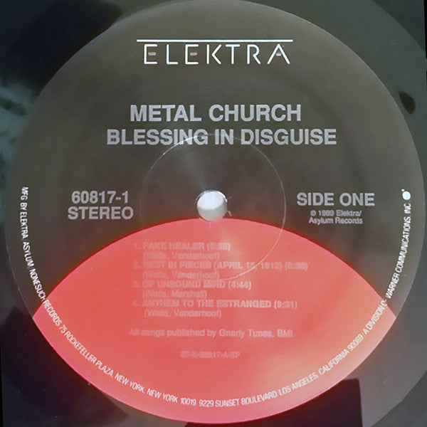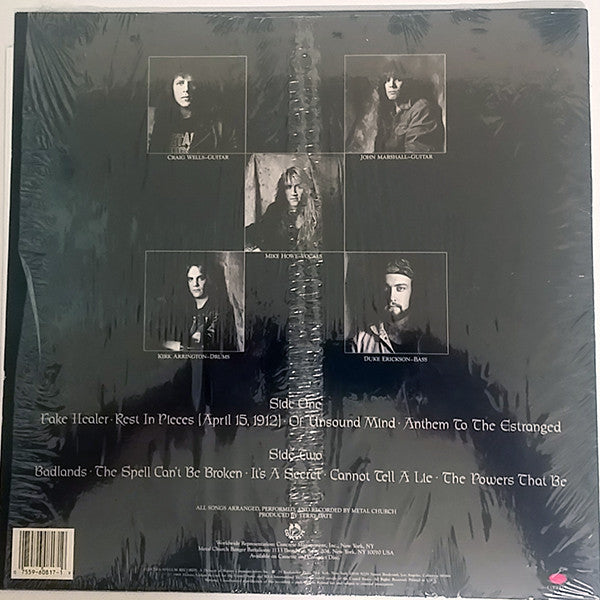 Black rectangular sticker on front : ----------------- Featuring Fake Healer Anthem To The Estranged Badlands Logo : Direct Metal DMM Mastering 60817-1 ---------------- "STAE" stamped in label mould. On lyrics insert : "Metal Church plays... ESP Guitars - Pearl Drums - Ernie Ball Strings & Some - other stuff."