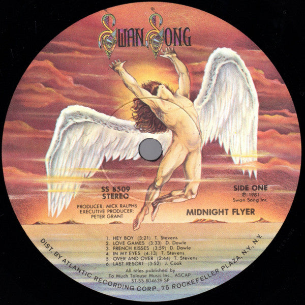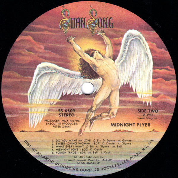 Gatefold Sleeve. Printed on back: SWAN SONG INC., Distributed by Atco, Division of Atlantic Recording Corporation, 75 Rockefeller Plaza, New York, New York 10019 ℗ © 1984 Swan Song Inc., 444 Madison Avenue, New York, N.Y. 10022 Printed in U.S.A. Warning: Unauthorized reproduction of this recording is prohibited by Federal law and subject to criminal prosecution. Printed innnersleve. Printed in lower left corner: SS 8509 Printed in U.S.A Printed in lower right corner: © 1981 Swan Song Inc.