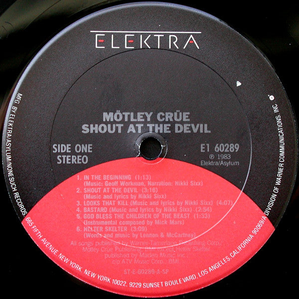 Produced by Tom Werman for Julia's Music, Inc. Recorded at Cherokee Studios, Hollywood, California Management: Doc McGhee and Doug Thaler for McGhee Enterprises, Inc. Manufactured by Columbia House under License. Elektra black and red label. Gatefold cover. Front sleeve is black with only band name and album title in red, no band photo nor glossy pentagram. Inner sleeve is white paper, on one side has lyrics printed in red, other side has a red pentagram. Back cover has band photo and "Caution: this record may contain backward messages."
