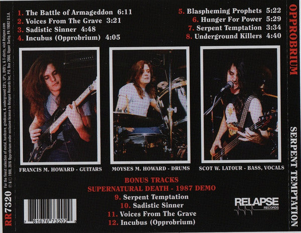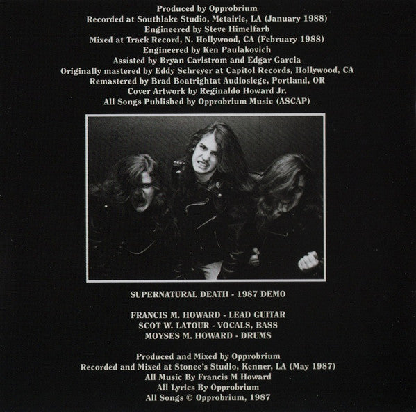 Recorded at Southlake Studio, Metairie, LA (January 1988). Mixed at Track Record, N. Hollywood, CA (February 1988). Originally mastered by Eddy Schreyer at Capitol Records, Hollywood, CA. Remastered by Brad Boatright at Audiosiege, Portland, OR. Supernatural Death - 1987 Demo recorded and mixed at Stonee's Studio, Kenner, LA (May 1987). All songs © Opprobrium, 1987. All songs © 1988 Opprobrium Music (ASCAP). All rights reserved. Lyrics printed with permission. ℗ & © 1998, 2016 Opprobrium under exclusive worldwide license to Relapse Records Inc.