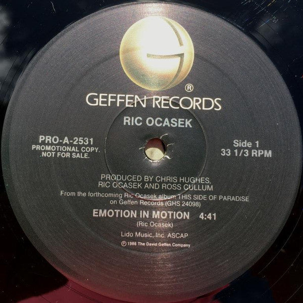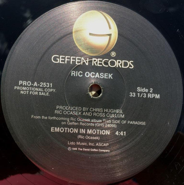 Promo 12" issued to radio Aug 1986. Issued in a 1-sided custom jacket (blank on the back) with a clear plastic inner sleeve. Same label & track on both sides (except for Side 1/2 designators), despite variation in the runouts. Promotional Copy. Not For Sale Runouts are etched with ᴍᴀsᴛᴇʀᴅɪsᴋ and Allied 'ɑ' logo stamped. From the forthcoming Ric Ocasek album This Side Of Paradise on Geffen Records (GHS 24098)
