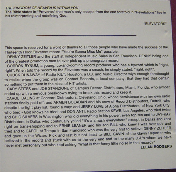 Originally released 1966. Recorded at Summit Sound Studio, Dallas Texas This reissue (p) 1979 International Artists, (c) 1991 Charly Records Ltd. Made in EEC. No SID codes on this cd. For a similar release manufactured by MPO, see [r=7224813.