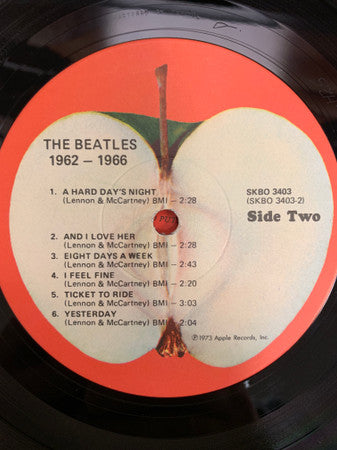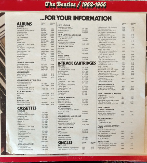 This pressing uses Sterling plating cut by [a383212 (Sides A, C, D) and [a360250's Capitol cut (Side B). Originally included custom printed red inner sleeves with lyrics in black text and a Beatles' (authorized) album discography insert.