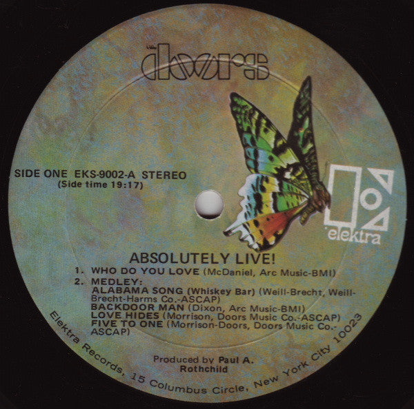 Butterfly label variant pressed by Monarch Record Mfg. Co. Elektra Records, 15 Columbus Circle, New York, N.Y. 10023 Gatefold; has Elektra inner sleeves This album was compiled from live performances recorded in cities throughout the U.S. between August, 1969 and June, 1970. Durations on back cover and labels: Side A (Side time: 19:17) Side B (Side time: 18:13) Side C (Side time: 18:00) Side D (Side time: 21:52) From back cover: Remote recording facilities provided by Fedco Audio Labs and Wally Heider Recording On-Stage Amplifications Systems By Vince Treanor Published By Doors Music Co., ASCAP Except: A1, A2b, C1 By ARC Music, BMI and A2a By Weill-Brecht-Harms Co., ASCAP Other first press releases with Butterfly labels with Columbus Circle adress in rim: Label variant pressed by Columbia Records Pressing Plant, Pitman Label variant pressed by Columbia Records Pressing Plant, Terre Haute Label variant pressed by H.V. Waddell Co.