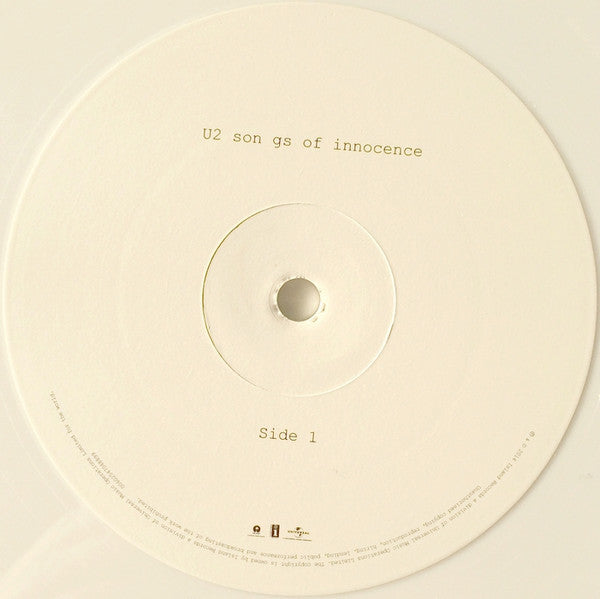 [a994633 appears courtesy of [l102069 / [l534568. Glossy gatefold sleeve. Inside picture of the gatefold is also printed inside the space for the records, making the cover black both outside and inside. Spine and labels state the album title as: Son gs of innocence No title on front cover except the sticker on shrinkwrap, which reads: "U2 son gs of innocence" Sticker on the back of the shrinkwrap album contains the barcode Side D runs at 45 rpm. Durations do not appear on this release. Timings via stopwatch.