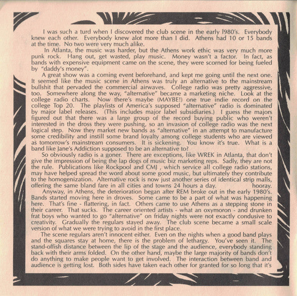 Slumberjack recorded at John Keane Studios, February 24-25, 1993 (24 track to 2" tape to DAT) Fiddlehead recorded live to 8 track in Betty Colquitt's basement, April 3, 1993 (8 track to 1/2" tape to DAT) The Go Figures recorded at John Keane Studios, March 27-29, 1993 (24 track to 2" tape to DAT) The Hard Ensemble recorded at John Keane Studios, January 1,2,3, 1993 (24 track to 2" tape to DAT) Regina Strap recorded at Suite 16 Studio, March 26, 27, 28, 1993 (16 track to 1" tape to DAT) BOB recorded at Furies Recording Studio, March 5, 6, 7, 1993 (16 track to 1/2" tape to DAT) The Martians recorded at Rocketsound, March 20, 21, 1993 (16 track ADAT to DAT) Harvey Milk recorded at Kelly Noonan's house ( = Suite 16 Studio)