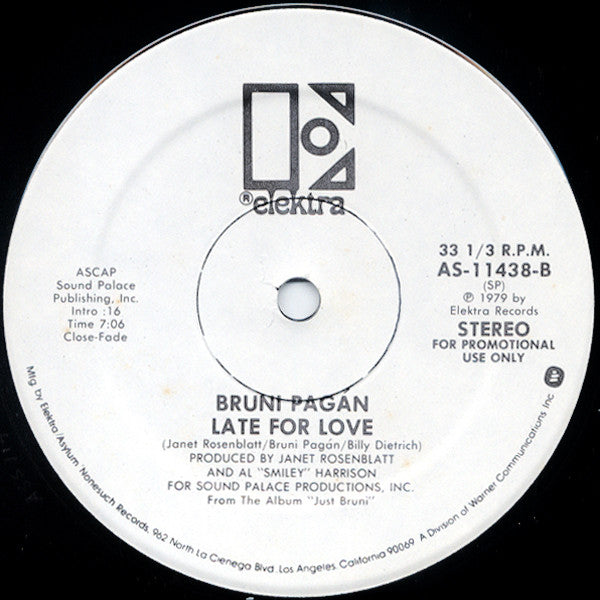 Produced for Sound Palace Productions, Inc. From the album "Just Bruni". ℗ 1979 by Elektra Records A-Side: ASCAP Leeds Music Corporation / PAP Music Division. Intro: 25 B-Side: ASCAP Sound Palace Publishing, Inc. Intro: 16 - Run-outs: A-Side: ASS 11438A-SP B-Side: ASS 11438B-SP