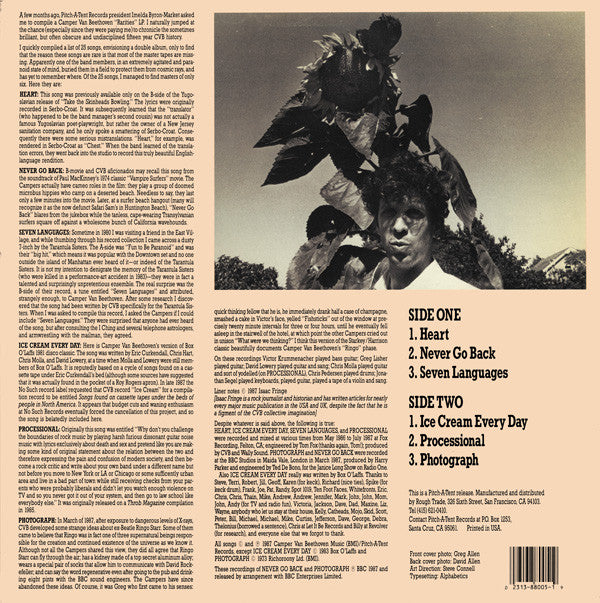 Tracks A1, A3, B1, B2 were recorded and mixed at various times from May 1986 to July 1987 at Fox Recording, Felton, CA. Tracks A2, B3 were recorded at the BBC Studios in Maida Vale, London in March 1987. Produced and engineered for the Janice Long Show on Radio One. Tracks A1 to A3, B2 © 1987 Camper Van Beethoven Music (BMI) Track B1 © 1983 Box O'Laffs Track B3 © 1973 Richoroony Ltd. BMI