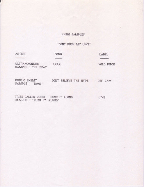 6th Boro Records There Are No Longer Just Five Boroughs! [a135888 remix available soon This Material Is Currently Being Shopped If Interested, call: 1-800-324-3333 PIN# (96968) 1713 Suite-A, Sherwood Street, Greensboro, NC 27403 Insert: Cheri Samples "Don't Push My Love" Artist: Ultramagetic, Song: 1,2,1,2, Label: Wild Pitch, Sample: The Beat Artist: Public Enemy, Song: Don't Believe The Hype, Label: Def Jam, Sample: "Don't" Artist: Tribe Called Quest, Song: Push It Along, Label: Jive, Sample: "Push It Along" Likely released during the 1990s.