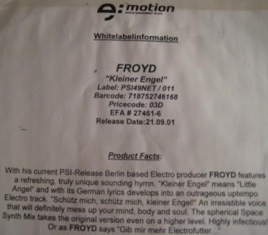 Stickered Promo Copy, Came With A4 Release Information Sheet, Distributed By e:motion, FROYD Says... Gib mir mehr Electrofutter.