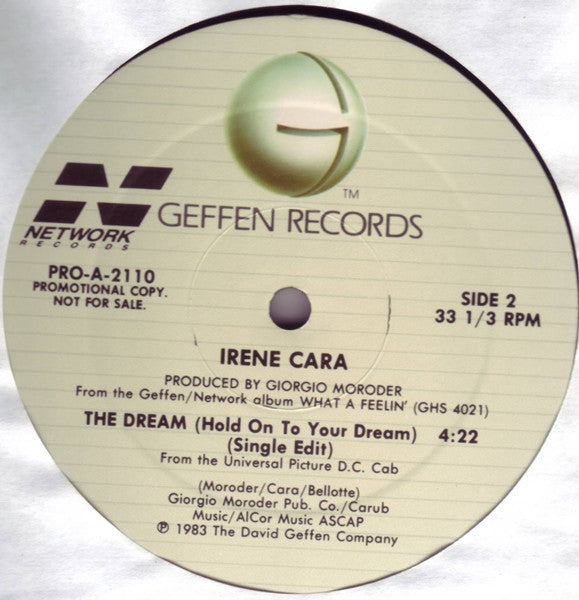 From the Geffen/Network album <a href=>What A Feelin'</a> [GHS 4021 Printed on the labels: "Promotional Copy. Not For Sale." © ℗ 1983 The David Geffen Company Made in U.S.A.