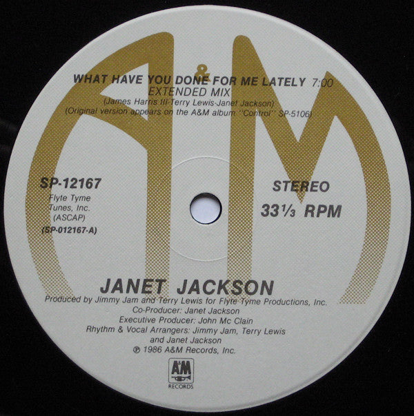 Produced for Flyte Tyme Productions, Inc. Original version appears on the A&M album "Control" SP-3905 Flyte Tyme Tunes, Inc. (ASCAP) ℗ 1986 A&M Records, Inc. © 1986 A&M Records, Inc. Printed in the U.S.A. RCAI = RCA Records Pressing Plant, Indianapolis pressing