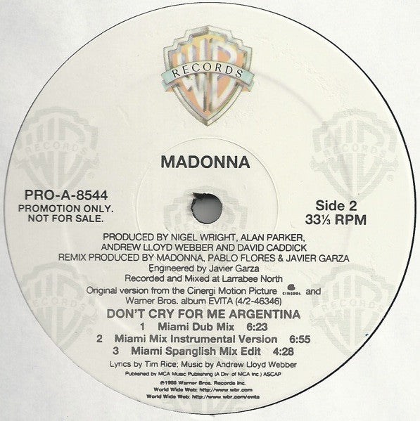 ℗ 1996 Warner Bros. Records Inc. Original version from the Cinergi Motion Picture and Warner Bros. album EVITA (4/2-46346). PROMOTION ONLY. NOT FOR SALE. Standard promo copy of "Advance Only" promo PRO-A-8544-A.