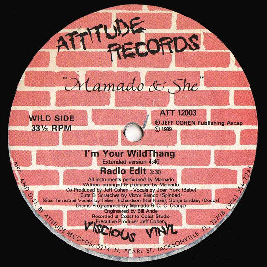 ℗ Jeff Cohen Publishing Ascap © 1989 Recorded at Coast to Coast Studio Mfg. and Dist. by Attitude Records/ 5214 N. Pearl St. Jacksonville, FL. 32208 (904) 354-7244 Cover sticker states: 'The Answer To Tone Loc "I'm Your Wild Thang" 4 Sizzling Mixes' Main title listed as "I'm Your Wild Thang" on the cover sticker but track titles listed as "I'm Your WildThang" on the center labels. I'm Your Wild Thang is a response to & parody of: "[m76160".