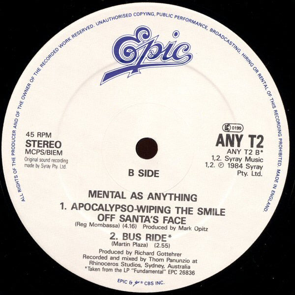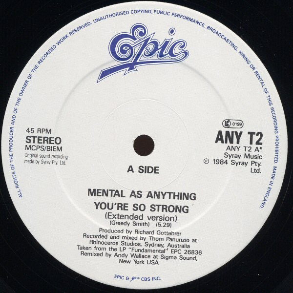 Track A & B2 taken from the LP/Cassette/CD “Fundamental” EPC 26836. Track A & B2 recorded and mixed at Rhinoceros Studios, Sydney, Australia. Track A remixed at Sigma Sound, New York, USA. Original sound recording made by Syray Pty. Ltd. Syray Music. ℗ 1984 Syray Pty. Ltd. © 1987 CBS Records. Epic and [Epic logo (R) CBS Inc. Made in England. Distribution: CBS Records / CBS Disques S.A.