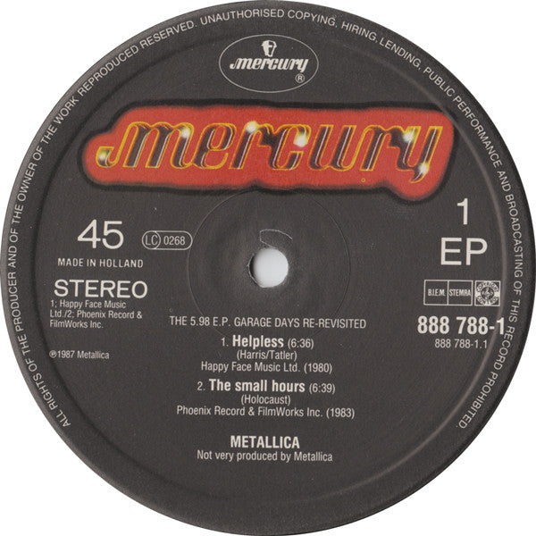 Released in a single or album sized cover with the opening is on the top. Recorded and mixed at A&M, & Conway, Los Angeles. ℗1987 Metallica ©1987 Creeping Death Music On sleeve: Printed in The Netherlands/Fabriqué en Hollande On labels : Made in Holland 1 on A side center label 2 on B side center label Some issues are released with a removable sticker "Mini LP 888 788-1"
