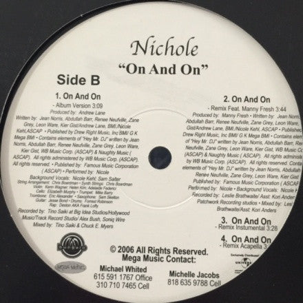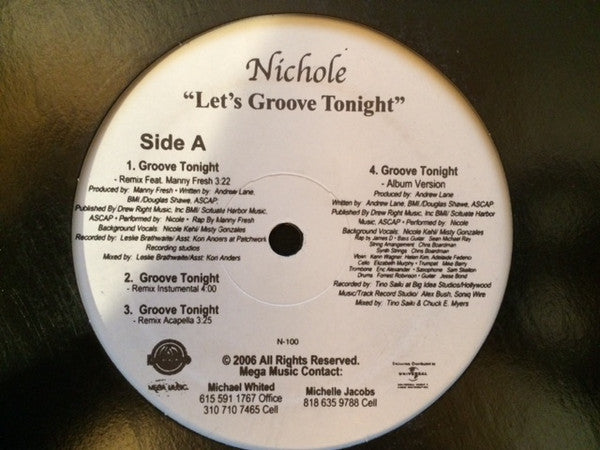 The artist and title have typos on both the vinyl & CD promos. The artist's name is Nicole Kehl (you can see the correct spelling on the credits in the image). Also, the track is called Groove Tonight (not "Let's Groove Tonight").