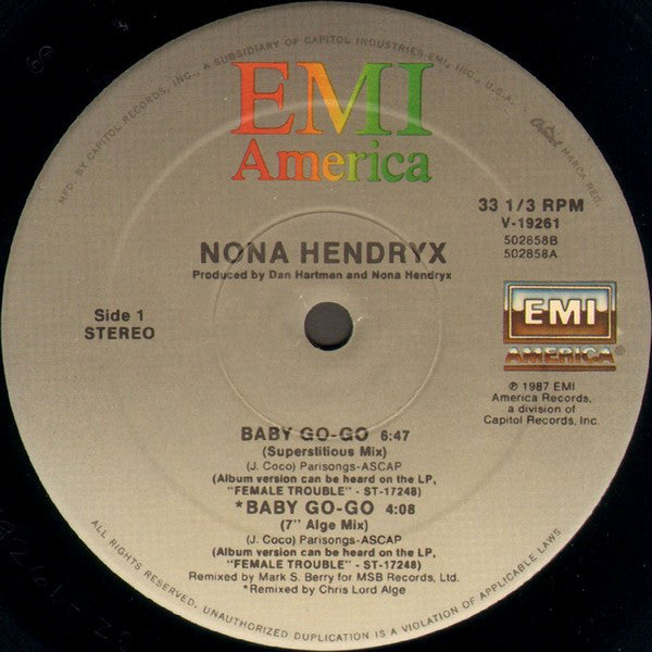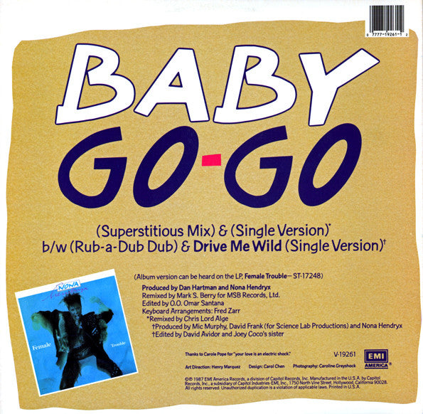 Cover, front: Baby Go-Go Superstitious Mix Cover, back: Baby Go-Go (Superstitious Mix) & (Single Version) b/w (Rub-a-Dub Dub) & Drive Me Wild (Single Version) (Album version can be heard on the LP, Female Trouble – ST-17248) [EMI America ® logo ℗ © 1987 EMI America Records, a division of Capitol Records Inc. Manufactured in the U.S.A. by Capitol Records Inc., a subsidiary of Capitol Industries-EMI, Inc. Labels: ℗ 1987 EMI America Records, a division Of Capitol Records Inc.