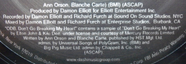 Recorded at Sound On Sound Studios, NY ℗ © 2005 The Island Def Jam Music Group "ODB, Don't Go Breaking My Heart" contains a sample of "Don't Go Breaking My Heart" by Elton John & Kiki Dee, under license and courtesy of Mercury Records Limited. Written by Ann Orson and Blanche Carte, published by HST Mgt. Ltd. admin by Universal Songs of PolyGram, Inc. (BMI) and Big Pig Music Ltd. admin by Chappell & Co., Inc.