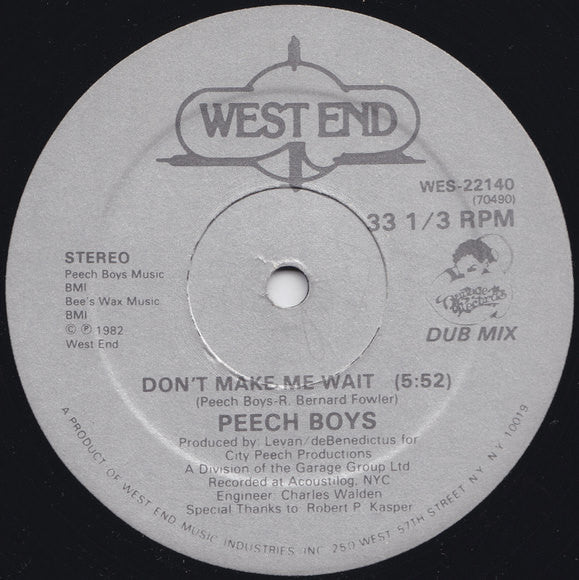 Produced for City Peech Productions. A division of the Garage Group Ltd. Recorded at Acoustilog, NYC Special thanks to: Robert P. Kasper Published by Peech Boys Music / BMI / Bee & Wax Music / BMI. © ℗ 1982 West End Mastering credit found etched in the runout groove