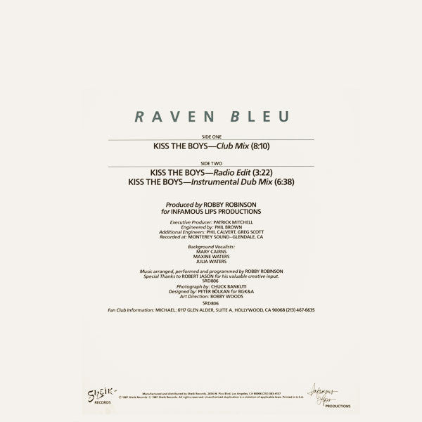 Produced for Infamous Lips Production Produced at: Monterey Sound Studios - Glendale, CA Recorded at: Monterey Sound - Glendale, CA Designed for BGKBA Published by Sea Lor Music / Ainsley Music / Grains Of Sand Music (ASCAP) Special Thanks to Robert Jason for his valuable creative input (P)(C) 1987 Sheik Records Manufactured and Distributed by Sheik Records Printed in U.S.A.
