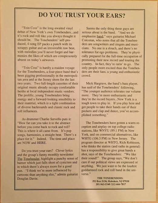 © 1988 The Tonebenders Recorded at Waterfront Studios, Hoboken, NJ. Mastered at Masterdisk N.Y.C. Tracks listed sequentially on release.