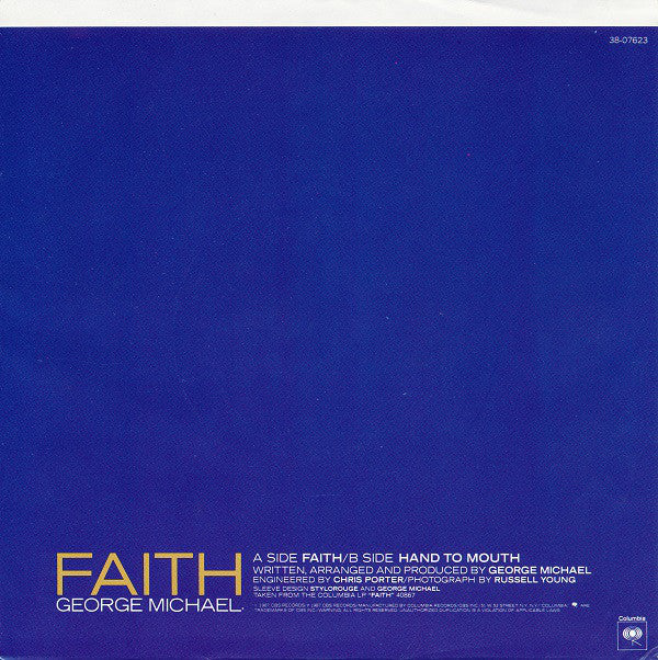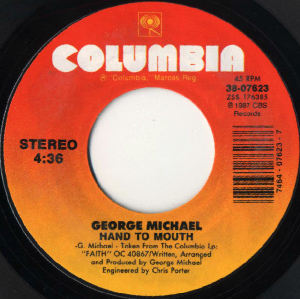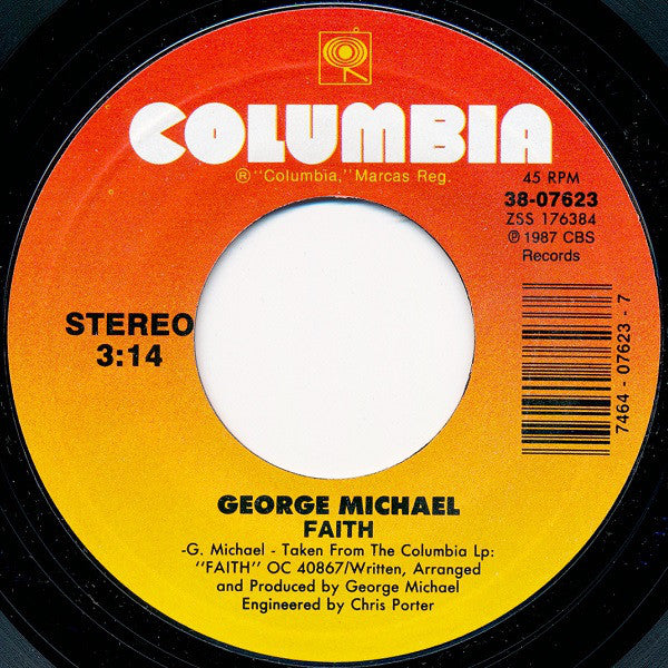 Picture sleeve variation of Carrollton pressing. Company sleeve is [r15142768 ©1987 CBS Records/℗1987 CBS Records Taken from the Columbia Lp: "Faith" OC 40867 Pressing plant credit is identified by runout etchings.
