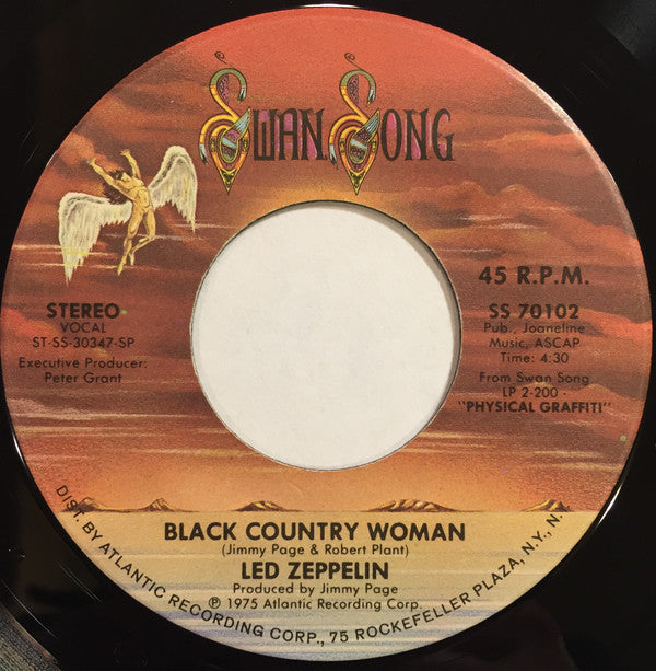 This version: 45 RPM printed on labels / No stroke in cat# From Swan Song LP 2-200 - "Physical Graffiti"